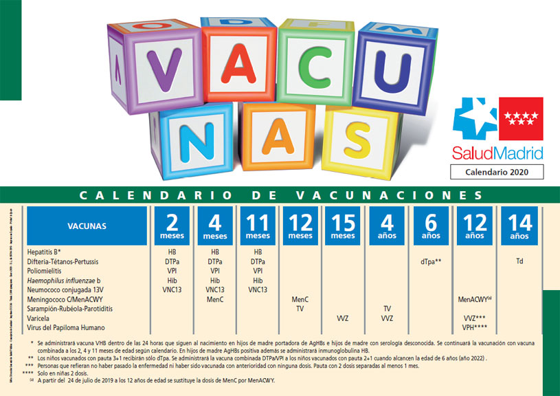 En el siguiente link puede consultar toda la información referente al calendario de vacunación, vigente en el año 2020 en la Comunidad de Madrid tanto para la población infantil como adulta, así como otros temas relacionados con la vacunación: https://www.comunidad.madrid/servicios/salud/vacunas
